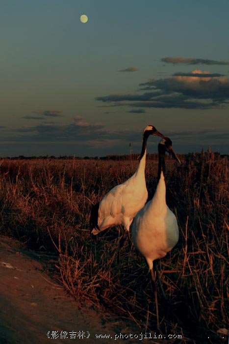 月老下,晚霞余晖映照双鹤。很美。