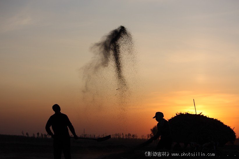 丰收的景象。场院的剪影很美。