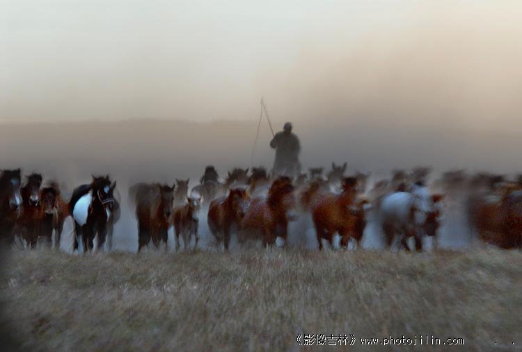 云雾缭绕的马群。漂亮。