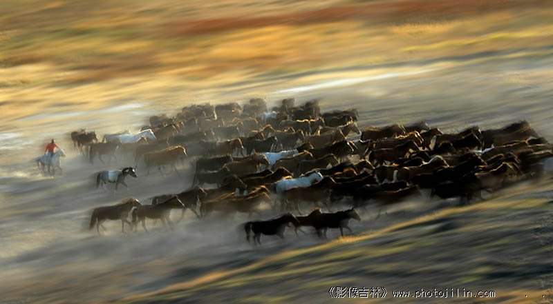 色调和影调具佳,抓拍很到位,遗憾的是马群没跑起来