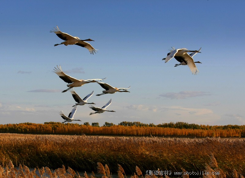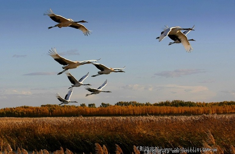 飞行的鹤与地面的芦苇呼应,鹤的形态也非常美。欣赏。
