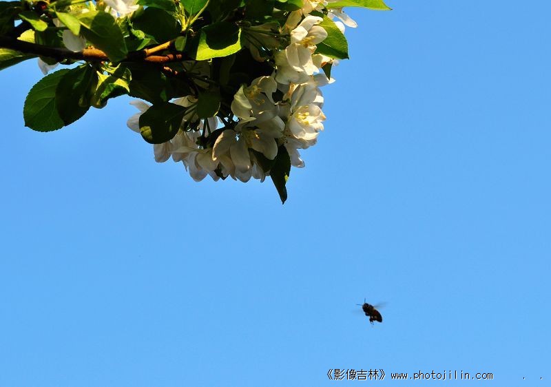 蓝天为背景,空间就显得开阔,蜜蜂的精神就突出出来了。