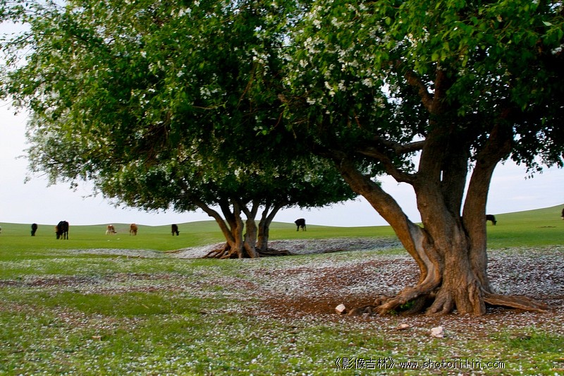 老树沉淀历史,落花铺垫绿野,近处遮风挡雨,远处牧草牛羊。很美的意境。