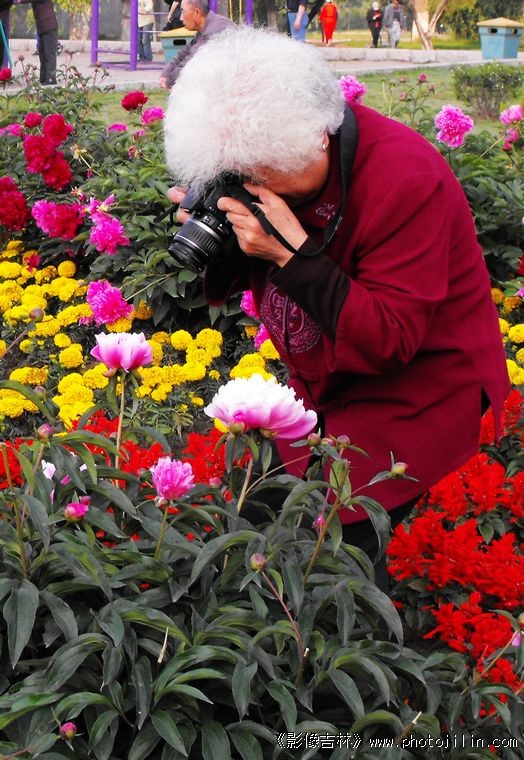 白发苍苍的老人手持相机,认真拍照。精彩画面!