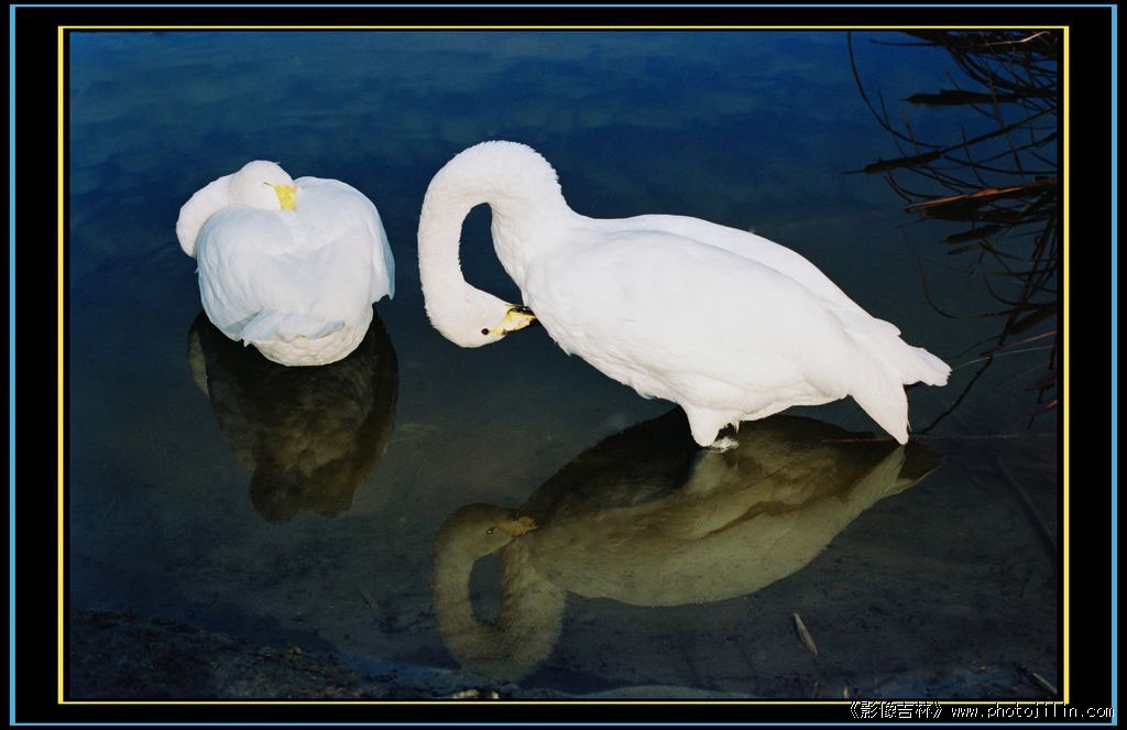 强烈的反差,突出了白天鹅的洁净。水里的倒影增添了片子的靓点。拍的漂亮。