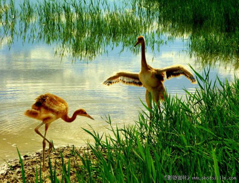 雏鹤展翅......水、草、天空倒影漂亮极了!动态 构图俱佳!