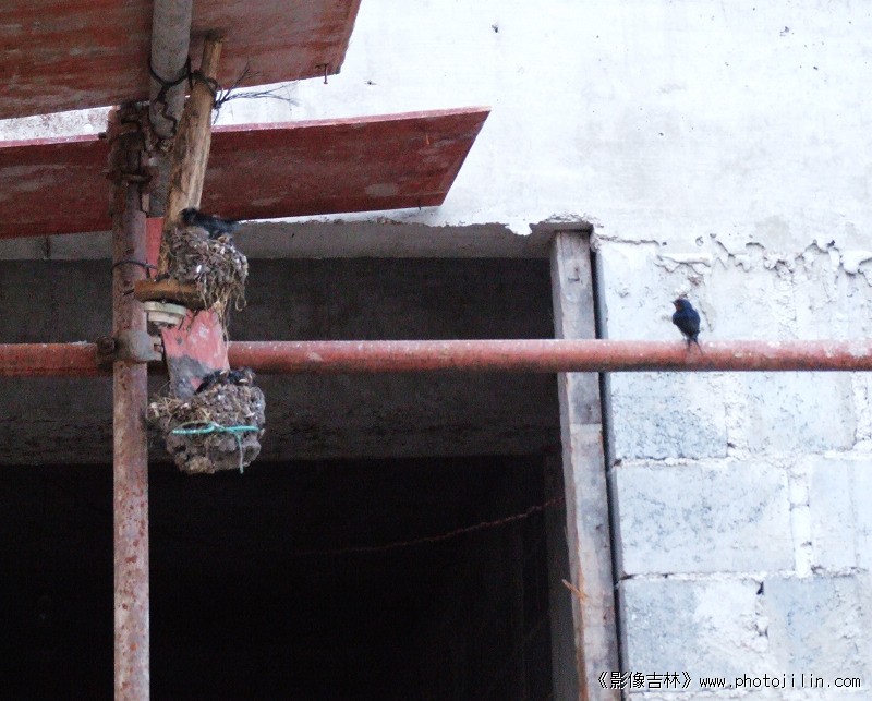 因房屋拆迁,两窝小燕儿被工人安置在工地脚手架上