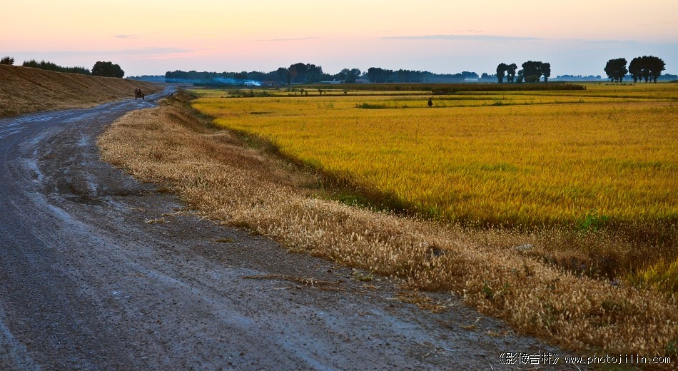 近处稻浪滚滚、远处炊烟袅袅,一派丰收景象····