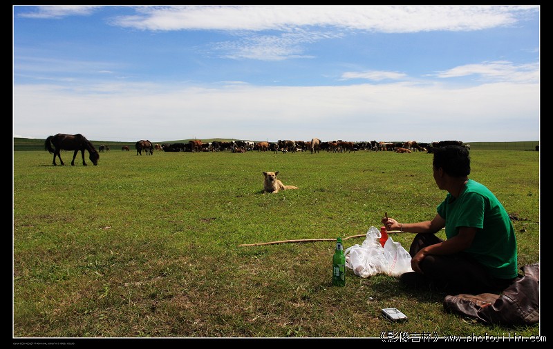 草原上的片子。蓝天白云,畜牧成群,近景中景远景摆布均匀。牧民带着吃喝,眼望畜群,狗亦中坚力量,给人以无限遐思。畜群与地平线应拉开。很好的片子,欣赏。