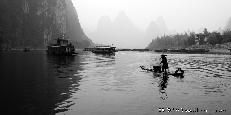 灰色雾里弥漫着神秘,明亮的水面漂浮着渔舟。近处鸬鹚、蓑衣、渔翁应有尽有,远处驼峰山环映四周。