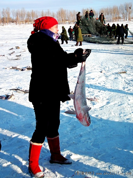 还是女孩子心细好奇!刚刚出水的鱼在雪地上连蹦带跳,她勇敢的把他抓起、说了一声:这鱼大吗?话音刚落、快门声咔咔响起!她就成了今天的主题··· ···