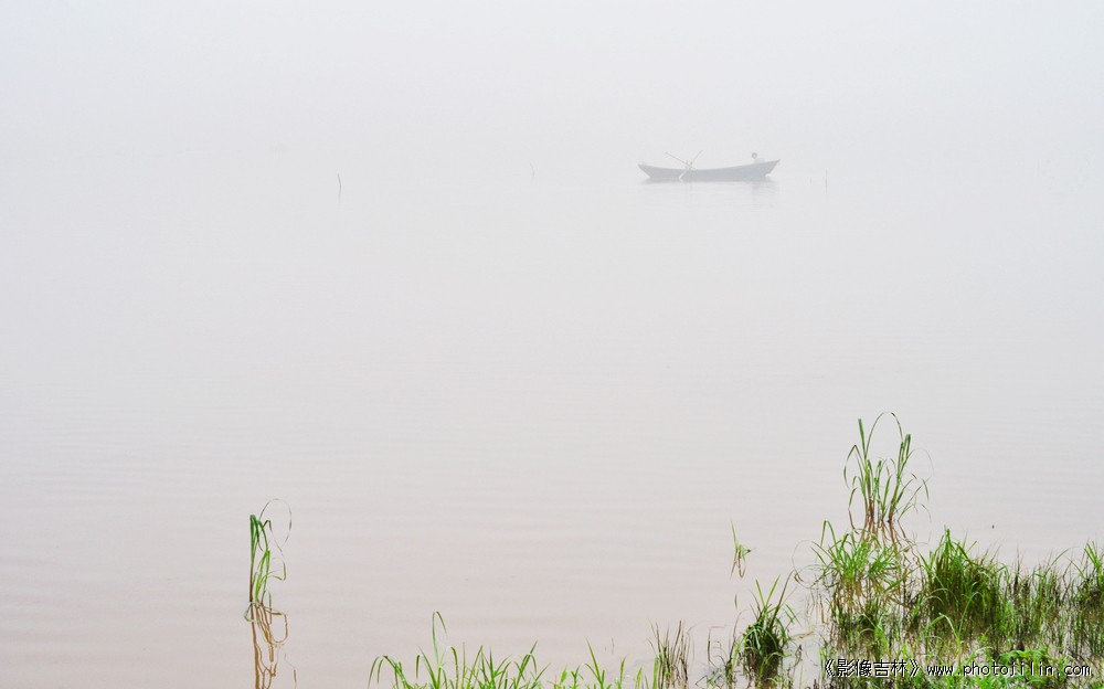 难得的拍摄。静静的湖面唯小船飘于水中、河边的绿草点缀给画面带来活力、是静与动的完美结合。:strong: