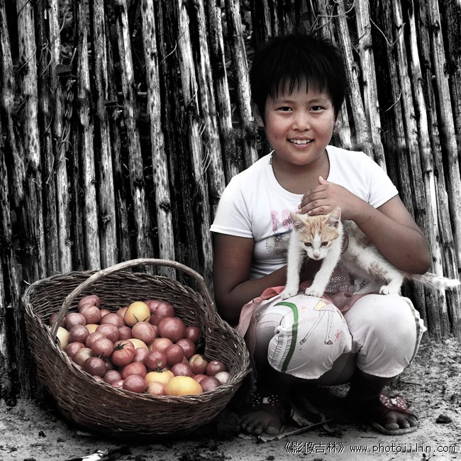 三元素(人、猫、筐)。非常和谐,人物非常美。