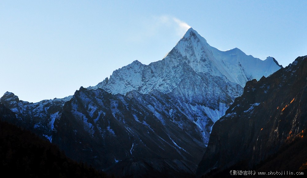央迈勇藏语意为“文殊菩萨”,位于四川亚丁自然保护区内,是“三怙主”雪山的南峰,海拔高度为5958米,在佛教中排在“三怙主”雪山之首。文殊菩萨在佛教中是有智慧的化身,雪峰像文珠师利用手中的智慧之俞直指苍穹,冰晶玉洁的央迈勇傲然于天地之间。神峰下由群山环绕着宽阔峡谷间,森林、草地、溪流和睦地各守一方,一派气势莽莽的自然景观。