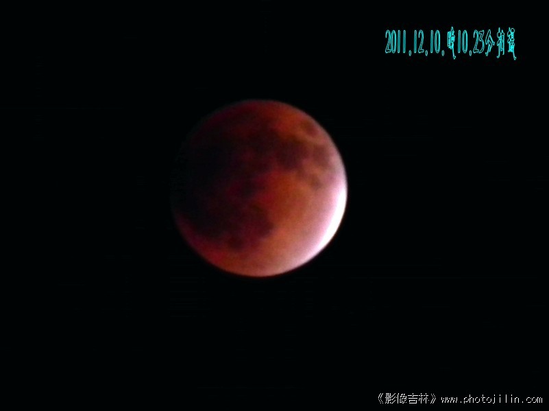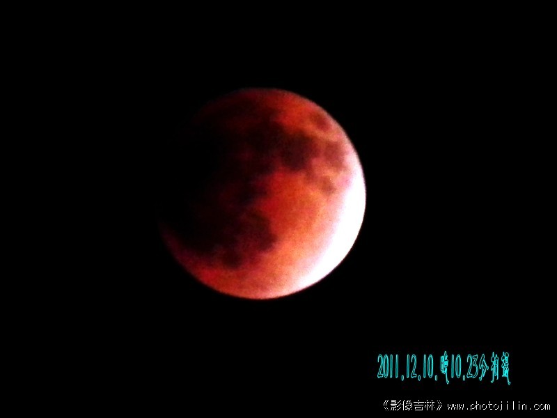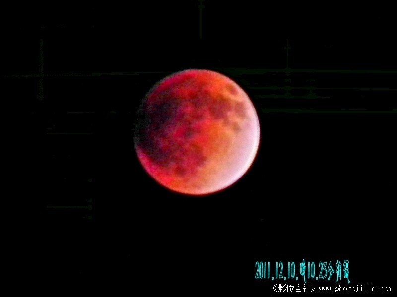 2011年12月10日晚10.06分到10.57分为红色月全食时间。据说:下一个月全食要到2018年。所以、这次月全食令人瞩目,拍了多幅、感到清晰度不够、看来还是装备问题!不论怎样权当是记录下这美好瞬间吧··· ···第一幅增加点亮度和颜色、第二幅加点对比、第三幅正常拍摄效果,三幅为三个拍摄画面。