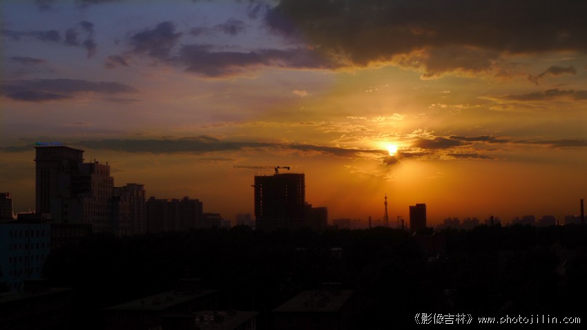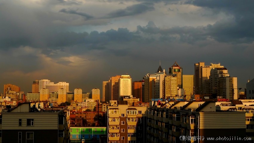 乌云笼罩下,一束光从云的缝隙中射出照亮了整个城市,形成冷暖调对比,非常漂亮。