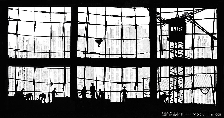 框架式构图,剪影形式表达,背景衬托,木刻式处理;整个画面严谨、充实,动静对比,虚实相宜,生动有力几近完美。非常漂亮,非常欣赏 。