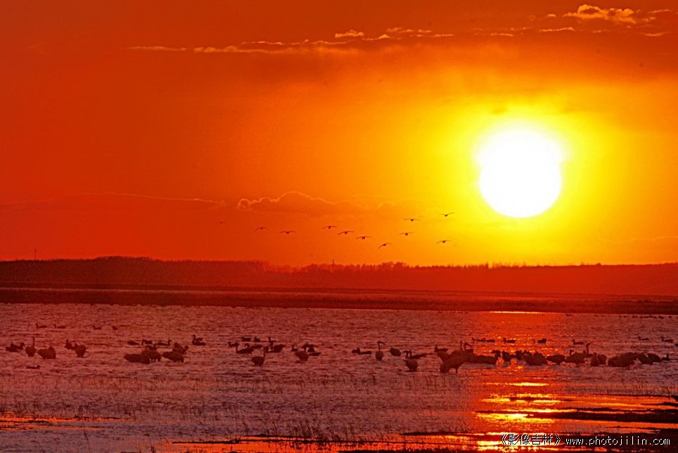 大雁和白鹤在夕阳中 嬉戏。