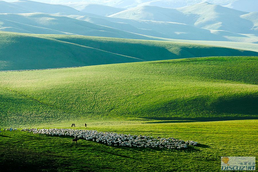 层峦叠嶂的群山,绿毯一样的草原和如白云般的羊群,共同构筑一幅天堂草原的美丽画卷。佳作,欣赏。