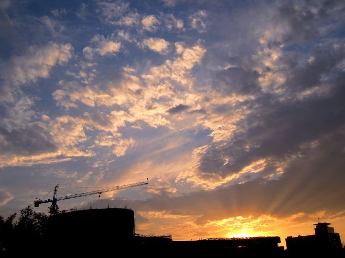 非常漂亮的一组晚霞片子。天空金光漫射,地面建筑工地正忙,给人一个充满希望和生机的氛围。片子曝光准确,影调亮丽,细节清晰,光影表现漂亮。[em17][em17]