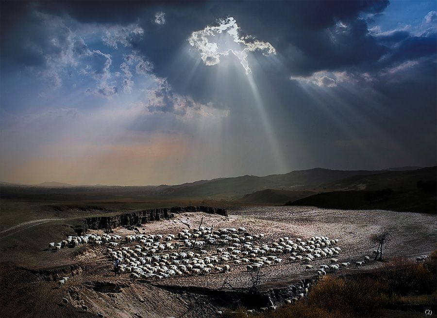 乌云、投射的光、大地、羊群,构成了一个理想的画面。漂亮。