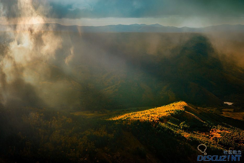 云雾缭绕中一缕射光照耀,产生漂亮的局域光在暗背景的衬托下格外突出、醒目。佳作。