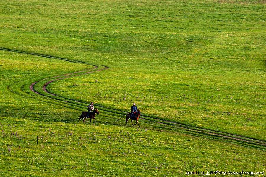 两个人物如同五线谱上的音符,欢快、跳跃。草原奏鸣曲。