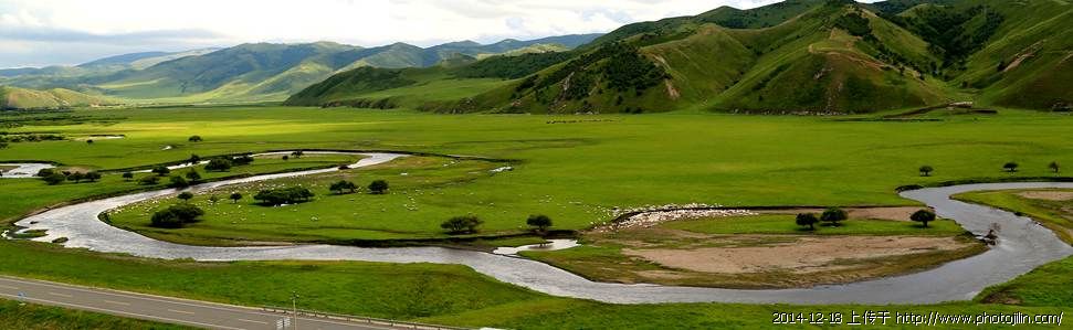 曲水蜿蜒,草地清新,羊群悠然,依山傍水,美景一幅。