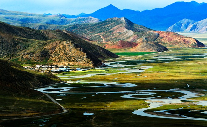 弯曲河流,起伏的山峦构成美丽和谐的画面。好!!