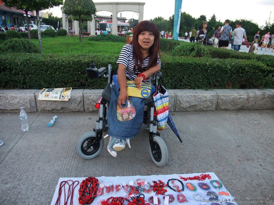 一个轮椅妹在这里经营她的朱砂红饰物。