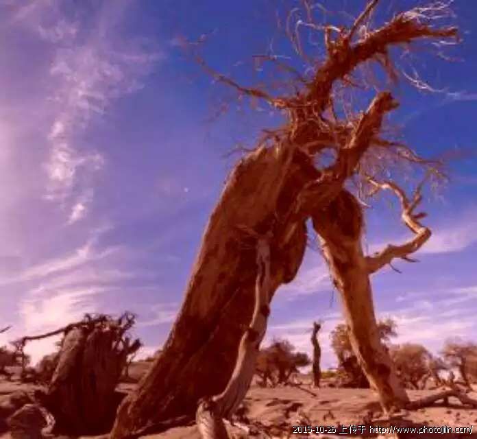看见金灿灿的胡杨着实让我兴奋,而当我徘徊于枯树林和怪树林里的时候,我不禁心生悲凉。虽然它们失去了金色的华冠,不能给人以美的展示,可它还坚强地站立在飞沙走石的戈壁滩,它那不朽躯干足以让人心生
