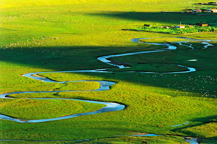 弯曲的小河象五线谱,影调.房屋.羊群象跳动的音符。美呀!