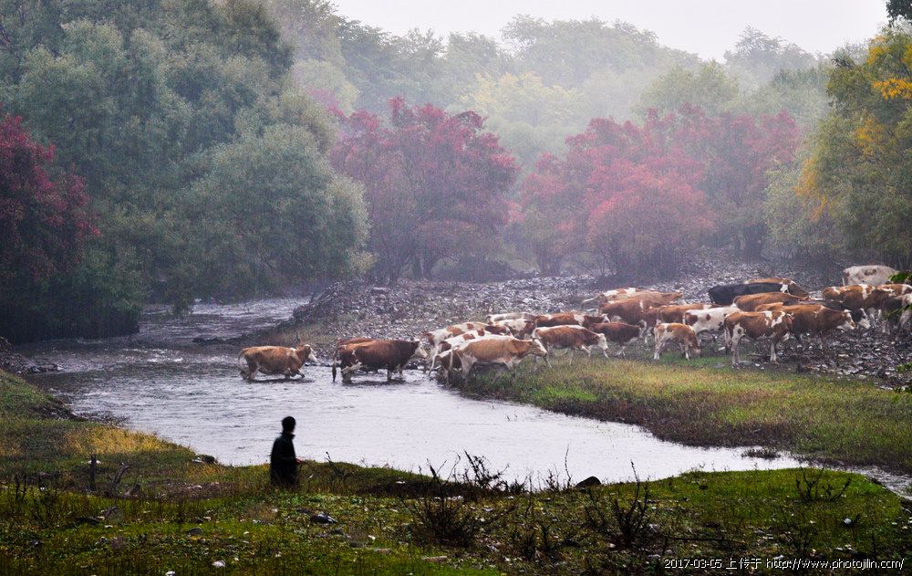 雾蒙蒙,山蒙蒙,秋染山林,隐约淡淡的五色山影。近景牛群趟过流淌的小河,画面在静中有动,组合出一幅漂亮的秋水牧牛图。赞赏!