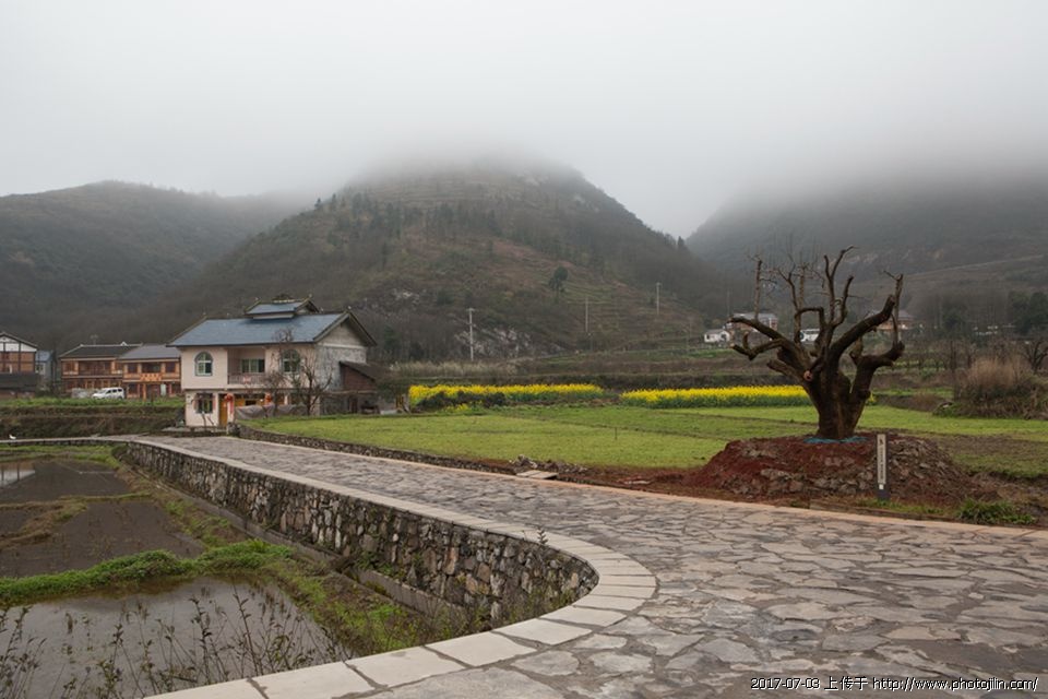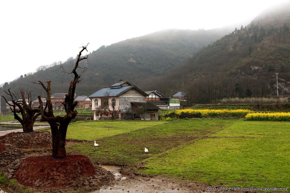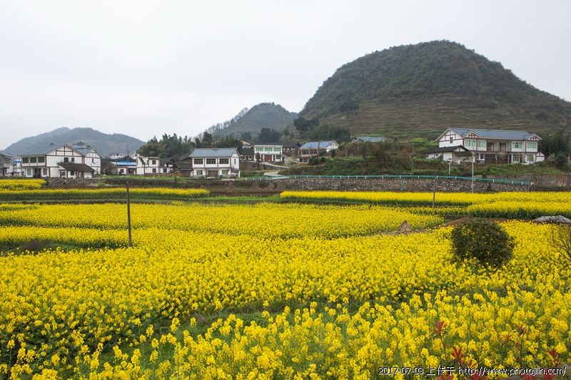油菜花盛开,江南村宅的特色托衬,使画面颇具南方风光的一种特色。