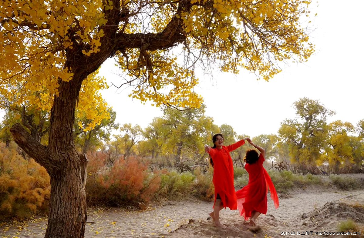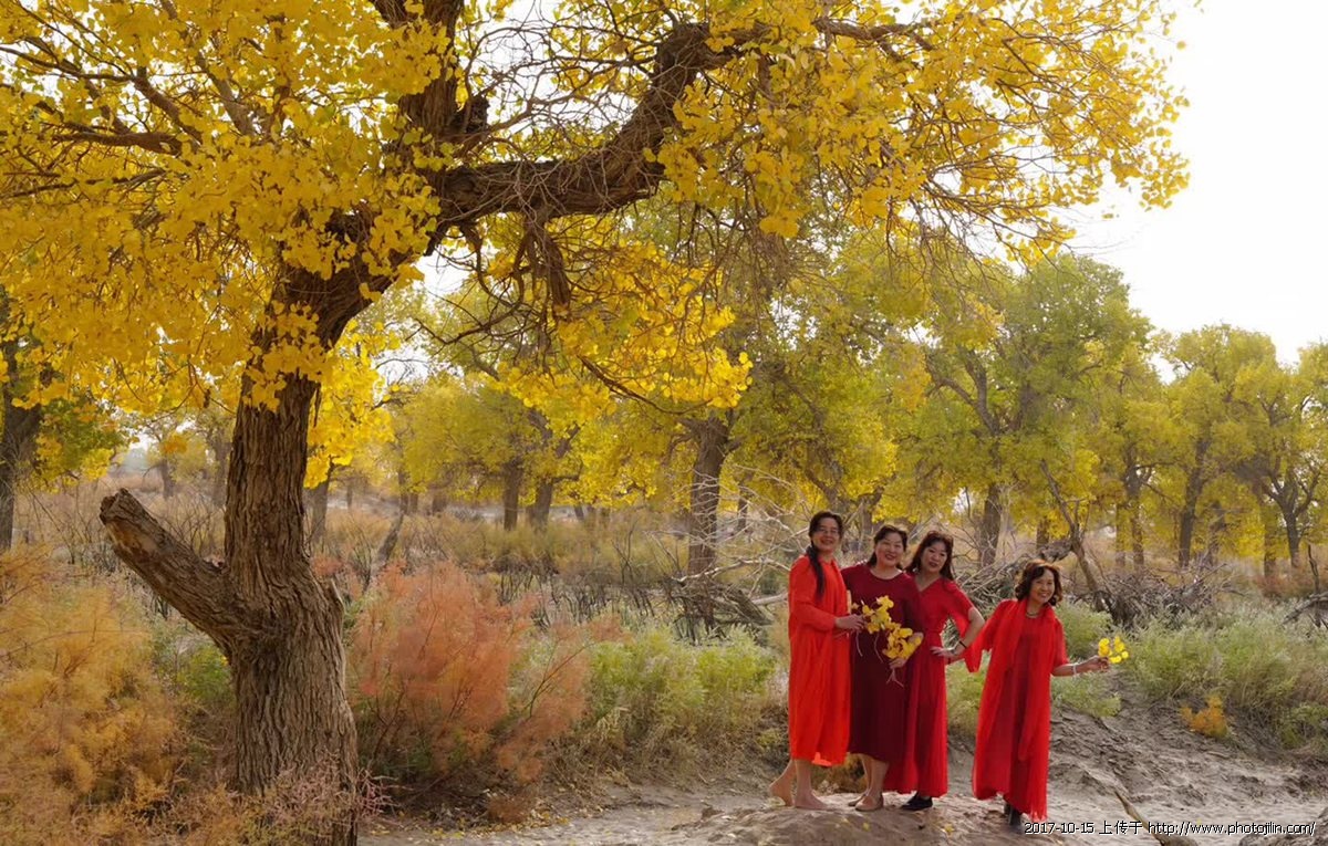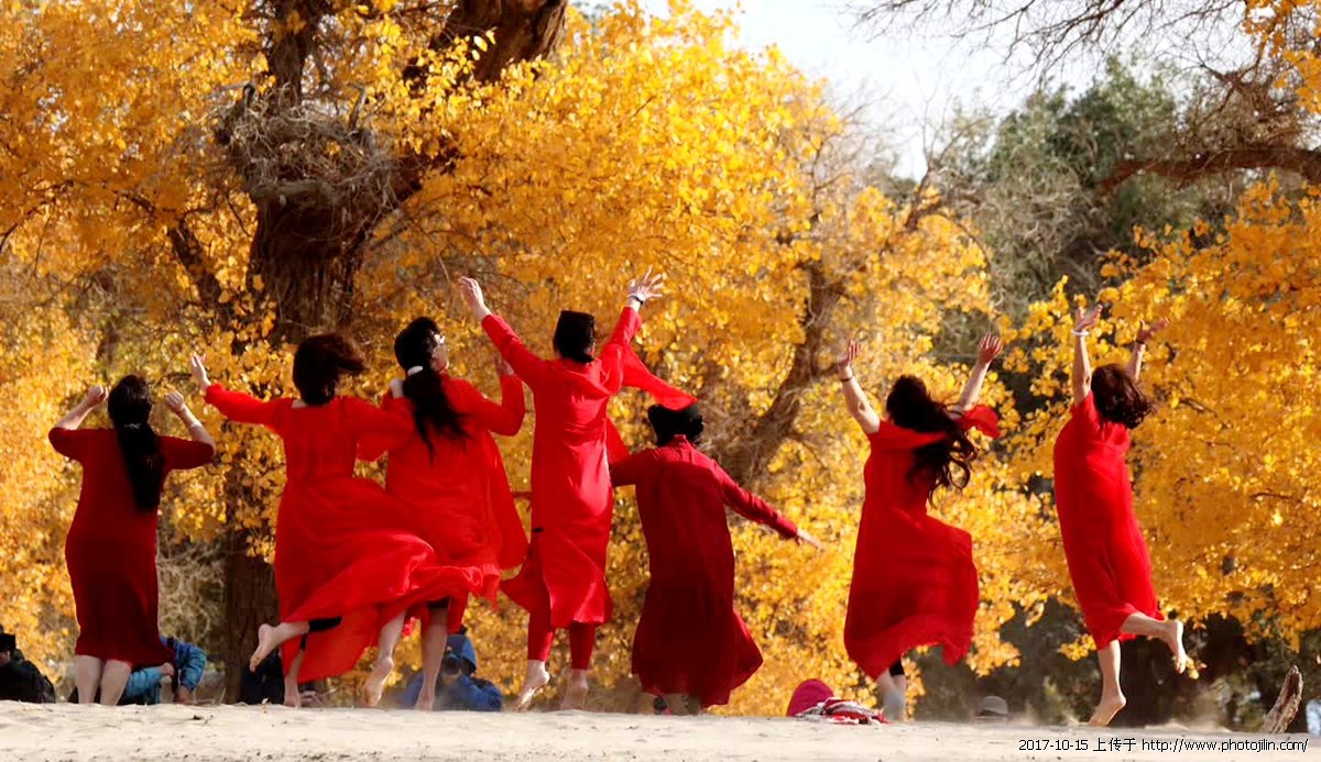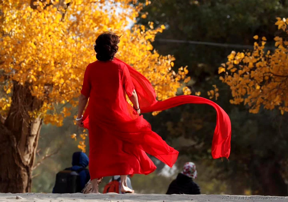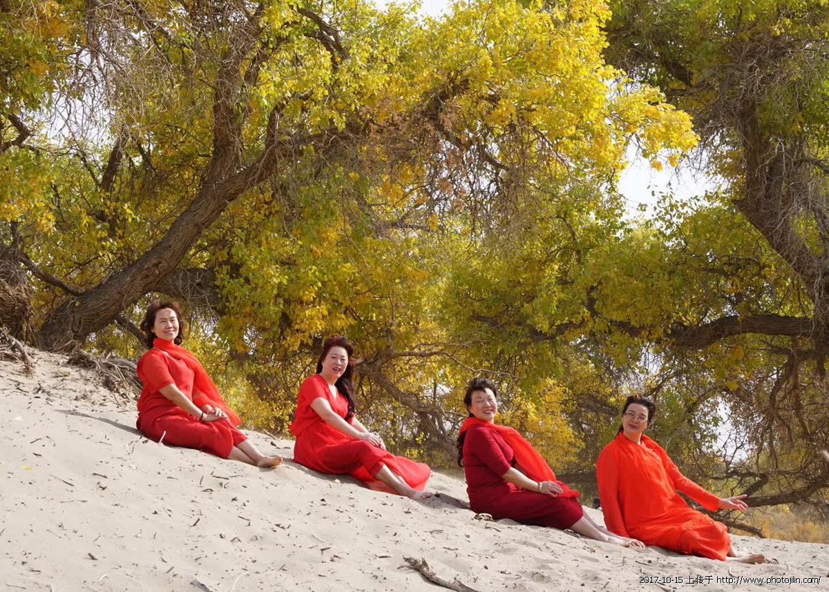 醉美胡杨 十月五日,额济纳胡杨林风景区是一个风沙天气,但是摄影的和游人仍然很多,她们中间有穿婚纱的,有抱琵琶乐器造型的,还有跳舞的热闹非凡。远处看到一群穿着红纱连衣裙的女士,在金黄色的胡杨树正摆造型,风沙吹过像是舞台上放烟饼,我用400长焦镜头,在远处拍下了这一精彩瞬间。事后才知道这些老大姐,她们来自湖北宜昌,看到她们如此热爱生活,我又给她们䃼拍了几张纪念照。
