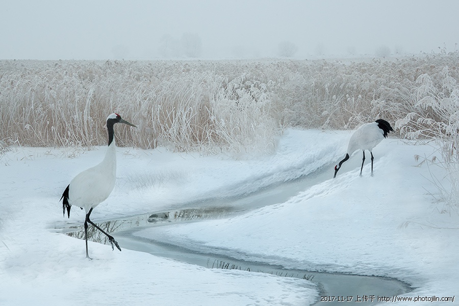 雪地霜天隆冬季,一双白鹤秀恋情。:D
