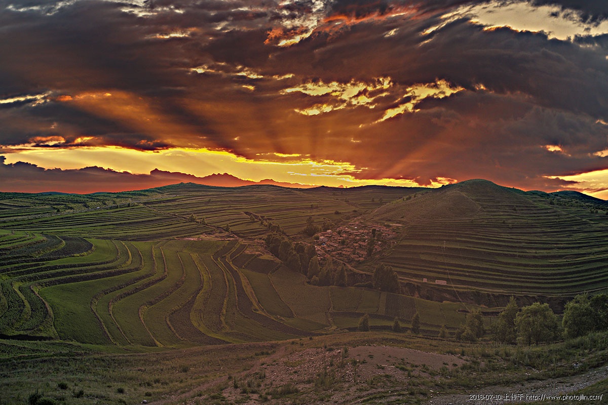 晚霞笼罩的山村