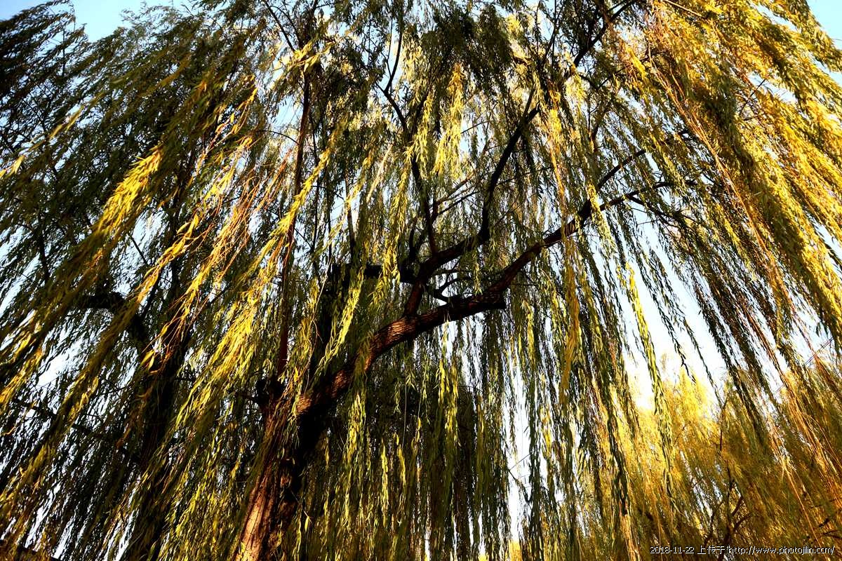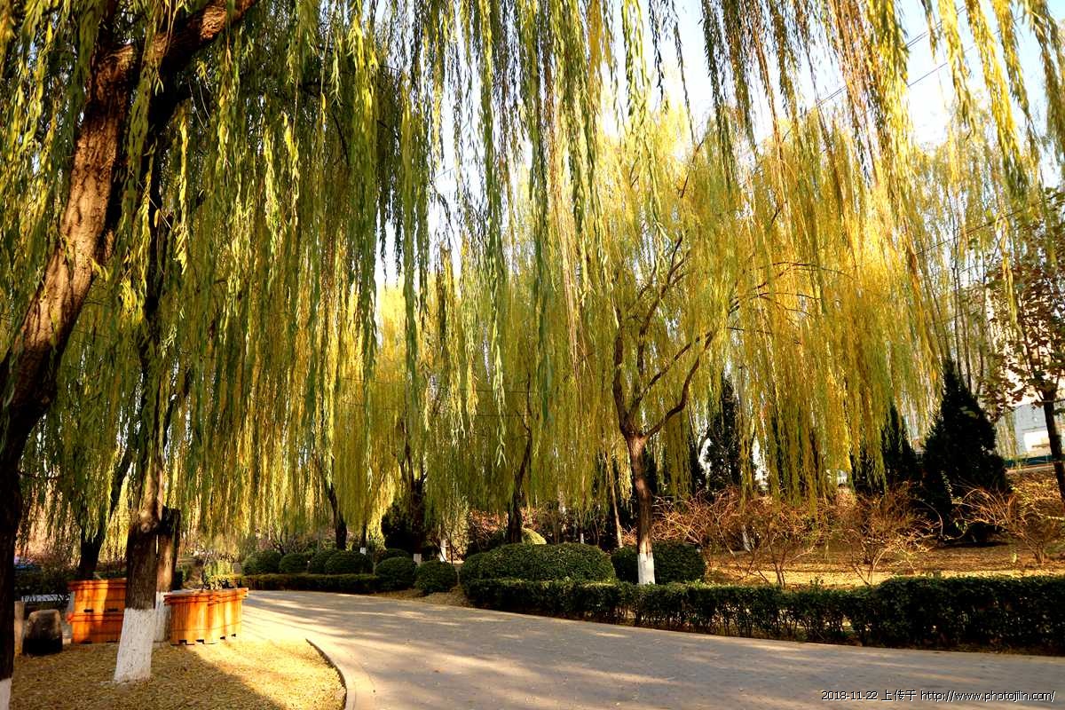 房山的柳树在坚守着最后的秋艳
