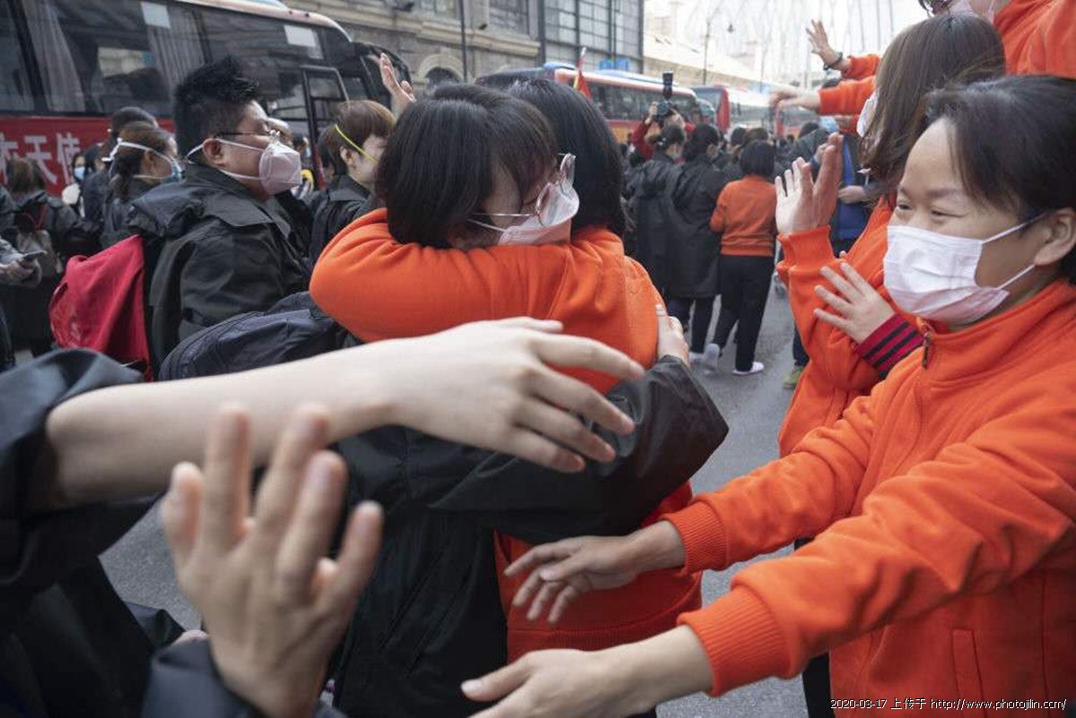 ↑3月17日,在武汉市武昌区驻地,江西医疗队员(红衣者)送别青海医疗队员。青海医疗队当日返程,两家医疗队在同一个驻地也在同一个方舱共事,结下了深厚的感情。