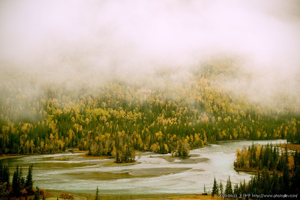 云雾缭绕下的金秋山脉,下面刚刚结冰的湖面组合成一幅秋季美景画面,很美! 赞!