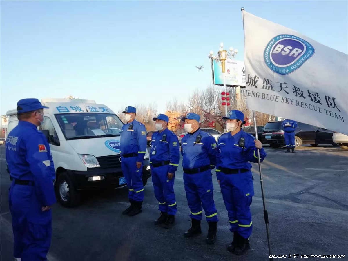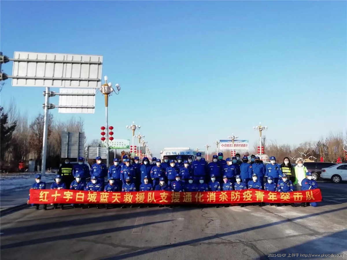 2月7日,欢送红十字白城蓝天救援队支援通化消杀防疫的四名队员出征。