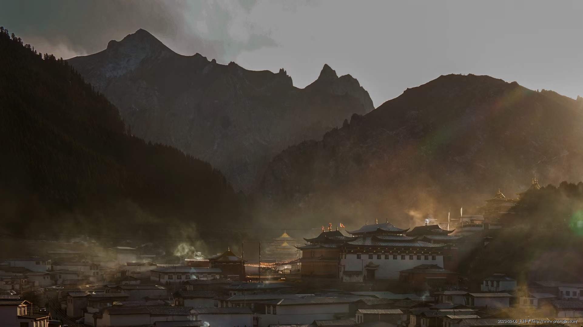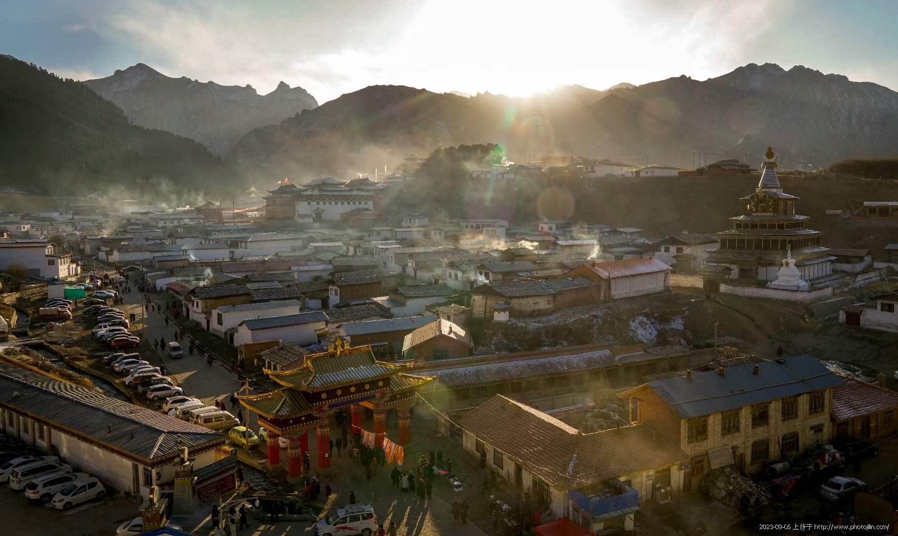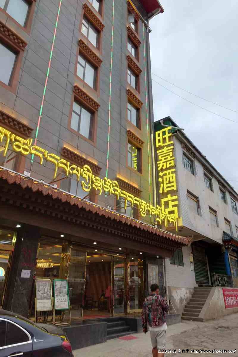 2017年2月,我和影友关伟明、张键、曹庆一行四人,从兰州包车到郎木寺参加晒佛节。正月十五的早晨我在郎木寺附近选择一个建设中的大楼,因冬季停工,我们就从大门下边悄悄的钻了进去,从一楼一直爬到8楼,气喘吁吁的急忙拍几张。今年8月,我带影友再次来到这里,走进旺嘉酒店直奔梯,来到8楼餐厅后,心情百感交集,一晃七年,这里街道、餐饮等变化太大了,心中有一种怀旧感。