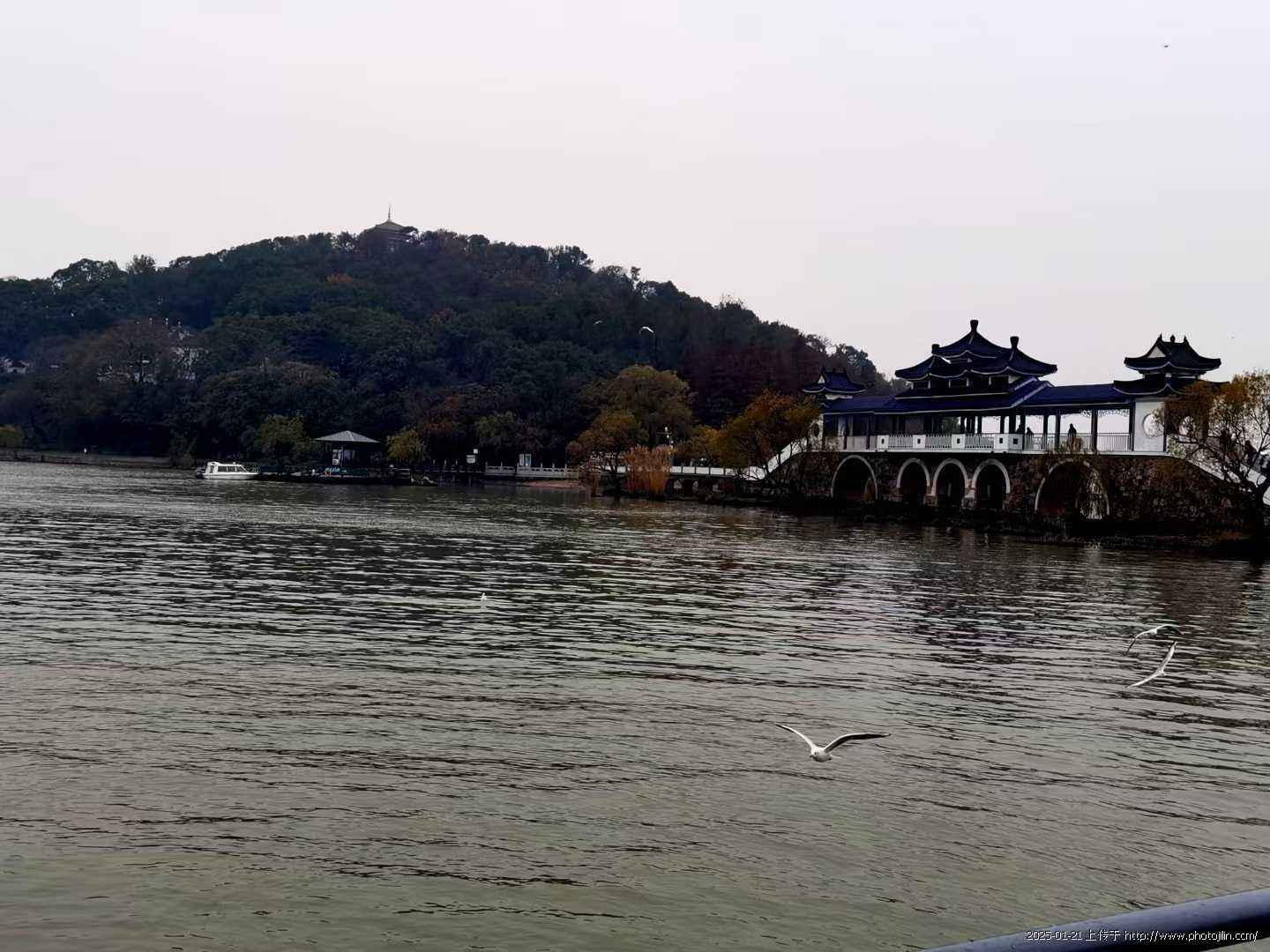 乘坐机动大游船去太湖的中心景点鼋头渚,其实是个很大的湖心岛。(图一)船的前后左右有很多的水鸟上下翻飞,多是因为游人从船上抛掷食物所致。有游人说这鸟叫西伯利亚红嘴鸥。(图四)