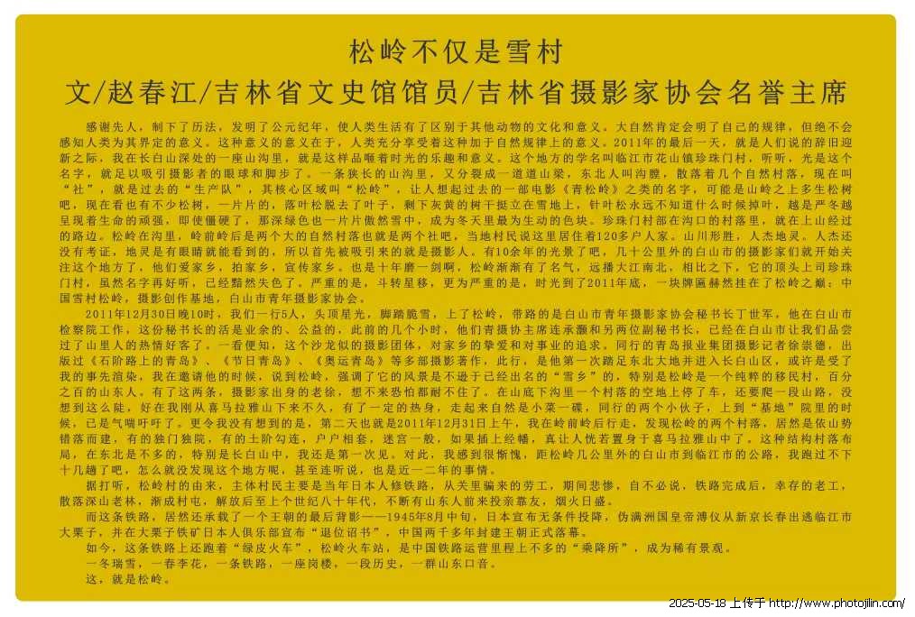 曾因省政府文史馆馆员'省摄协名誉主席赵春江一篇《松岭不仅是雪村》而闻名遐尔的松岭雪村'坐落在吉林省东南部临江市花山镇20里外的偏僻山坳里,海拔1200米,有百余户人家,是一个典型的山东移民村,以其独特的春天梨子花和冬季雪景和淳朴的民风而闻名!正在建设的高速公路但愿能保持这一难得的乡愁…