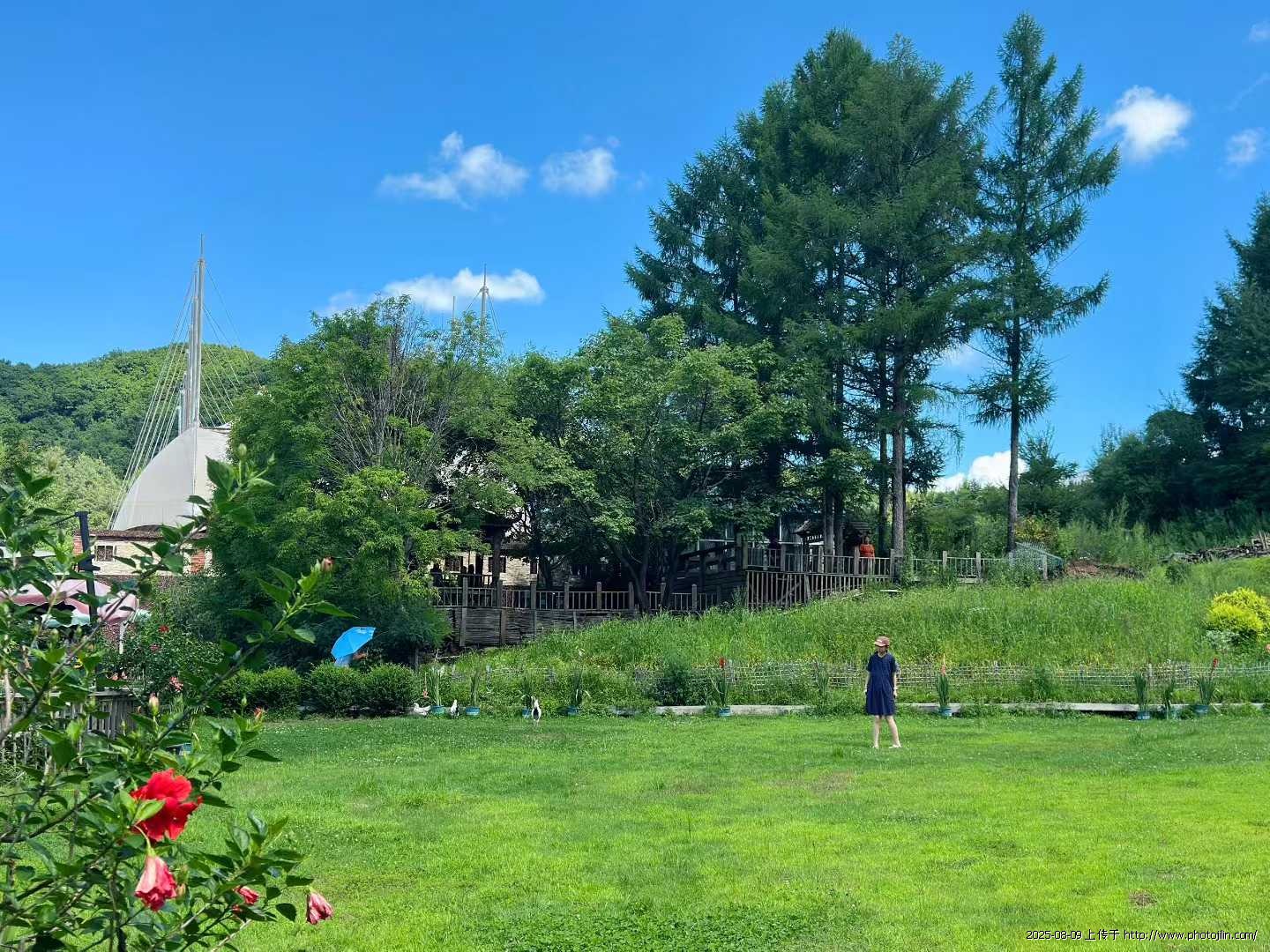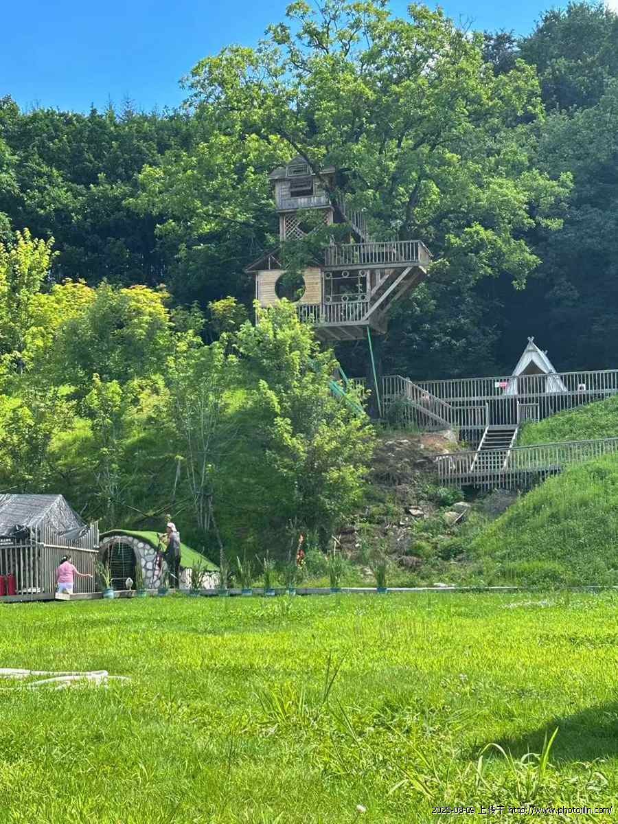 隐匿在茂密枝叶间的树屋,造型独特,层层叠叠,仿佛是从童话世界里自然生长出来的奇妙居所。在大片翠绿草坪前,草坡上的石阶蜿蜒而上,游客的身影点缀其中。有人正缓步攀登,享受着这一份悠然自得;有人撑伞前行,似乎在细细品味着自然的馈赠;还有人在草坪上摆出各种姿势拍照,试图将这美好的瞬间定格。远处的木栈道与帐篷,巧妙地融入山林的绿意之中,以蓝天为映衬,处处洋溢着亲近自然、惬意游玩的美妙氛围。