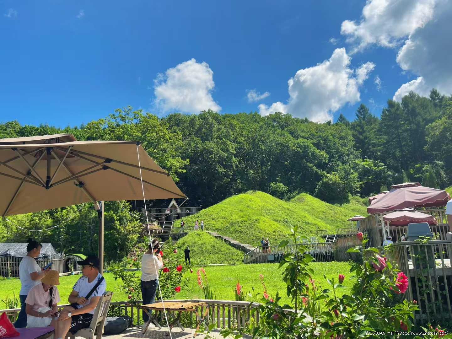 蓝天白云下,绿树草坪间,蜿蜒的石阶、古朴的栈道、温馨的帐篷,还有灵动的游客,共同构成了一幅和谐而美好的画面。面对如此美不胜收的景色,我不禁心潮澎湃,不由自主地举起手机进行自拍,把自己融入到美景里,留下这难忘的瞬间,将这份美好永远珍藏。