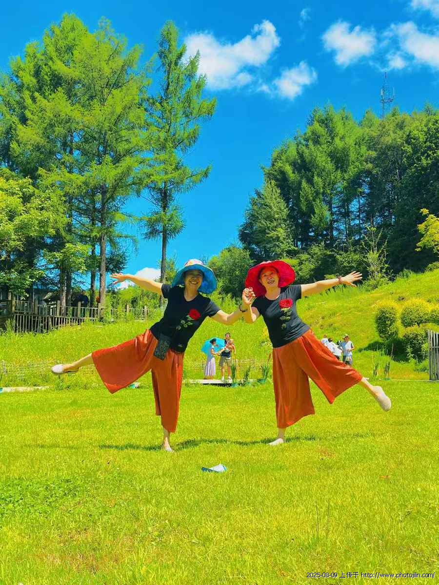 在这片绿意盎然的草地上,老伴和亲家母姊妹俩格外引人注目。她们身着同款黑衣红裙,鲜艳的色彩在绿色草地的衬托下愈发夺目。头上佩戴的彩帽,增添了几分浪漫与活力。只见她们一手紧紧相牵,一手优雅地伸展,单腿轻轻抬起,身姿舒展,笑容灿烂,浑身散发着轻松惬意的气息,仿佛将内心的欢乐毫无保留地泼洒在这大自然之中。