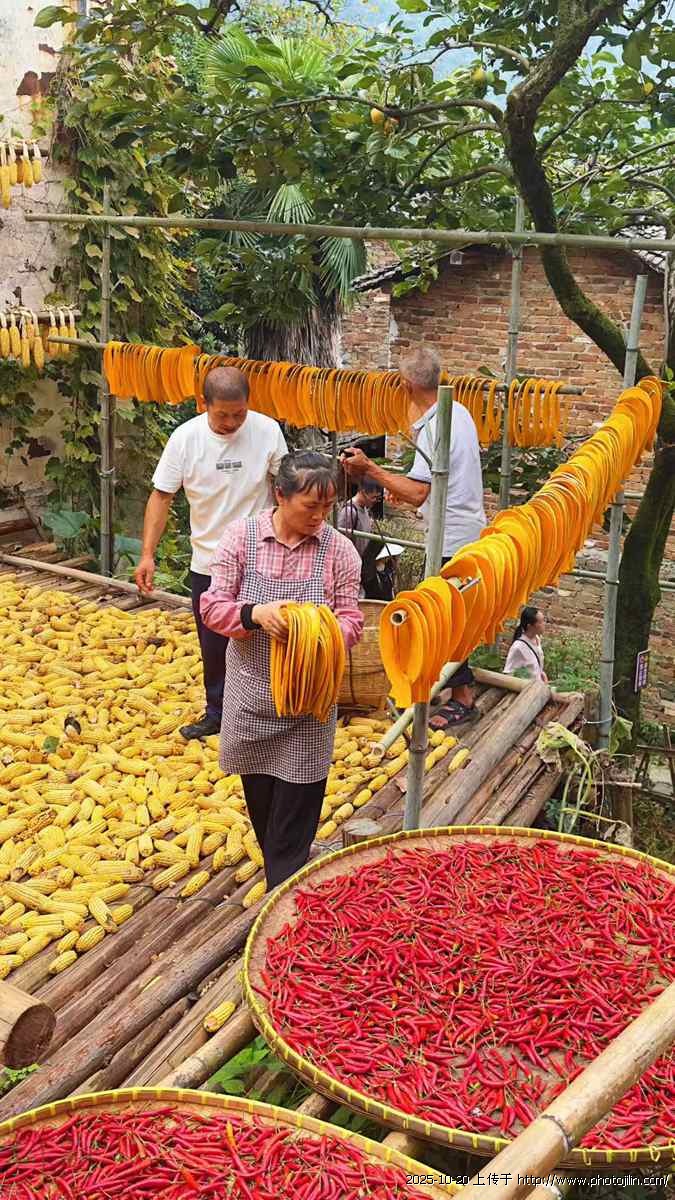 沿着木栈道前行,只见村民们正忙碌地整理着晒架上的作物。他们的双手在辣椒与玉米间穿梭,动作娴熟而温柔,仿佛在呵护着一件件珍宝。这场景让我明白,晒秋于篁岭人而言,不是简单的劳作,而是一种传承,一种将生活过成诗的智慧。