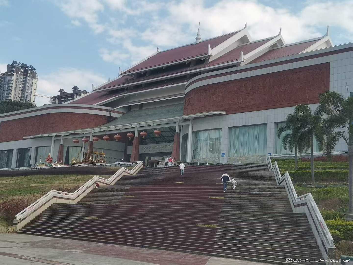 博物馆建筑融合了傣族传统杆栏式民居与现代设计元素,屋顶造型如孔雀展翅,极具民族风情。