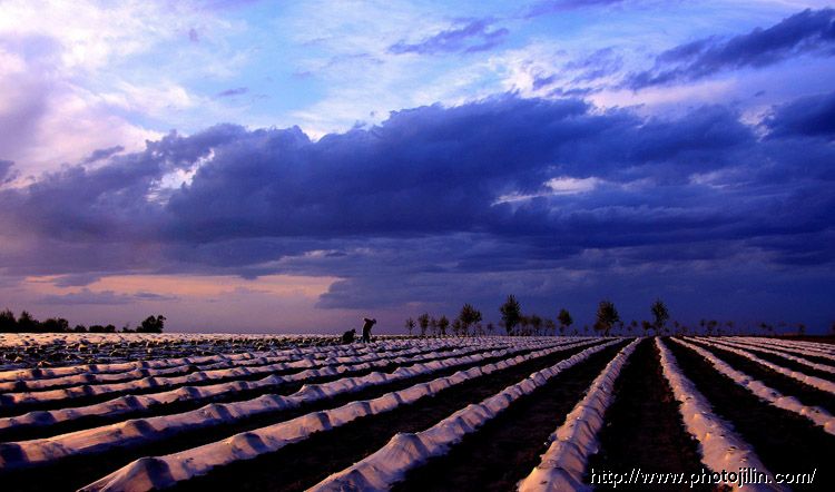 作品巧妙地利用了地膜透光的特性,运用侧光,使地垄走向分明,生机勃勃.天空的云与劳做了一天的农民遥相呼应.增添了农忙时节的紧迫感.一个普通的场景被精彩地展现出来.